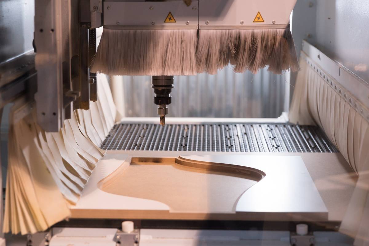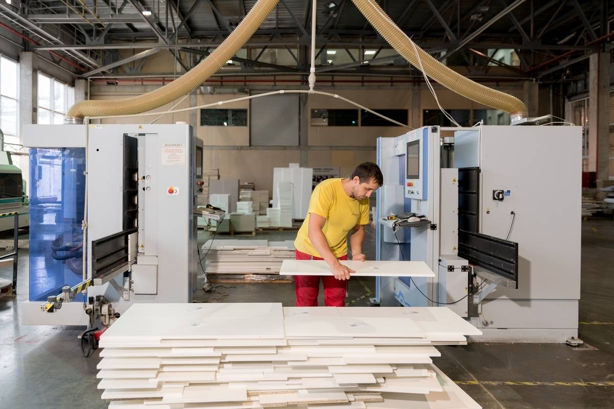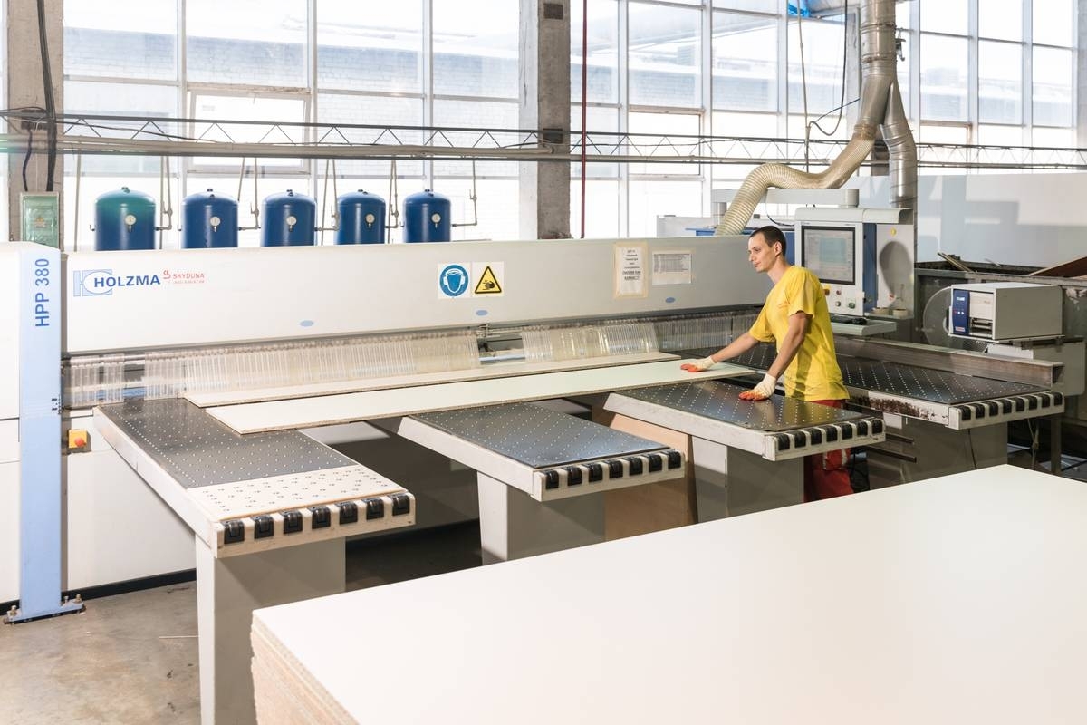 A chipboard sheet is sawn into pieces of the required dimensions on a Holmza machine (Germany). The equipment is controlled by a computer, so cutting error is minimal. The material is placed on an air cushion, which protects it from scratches.