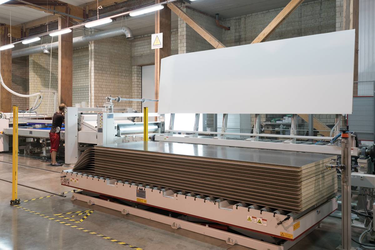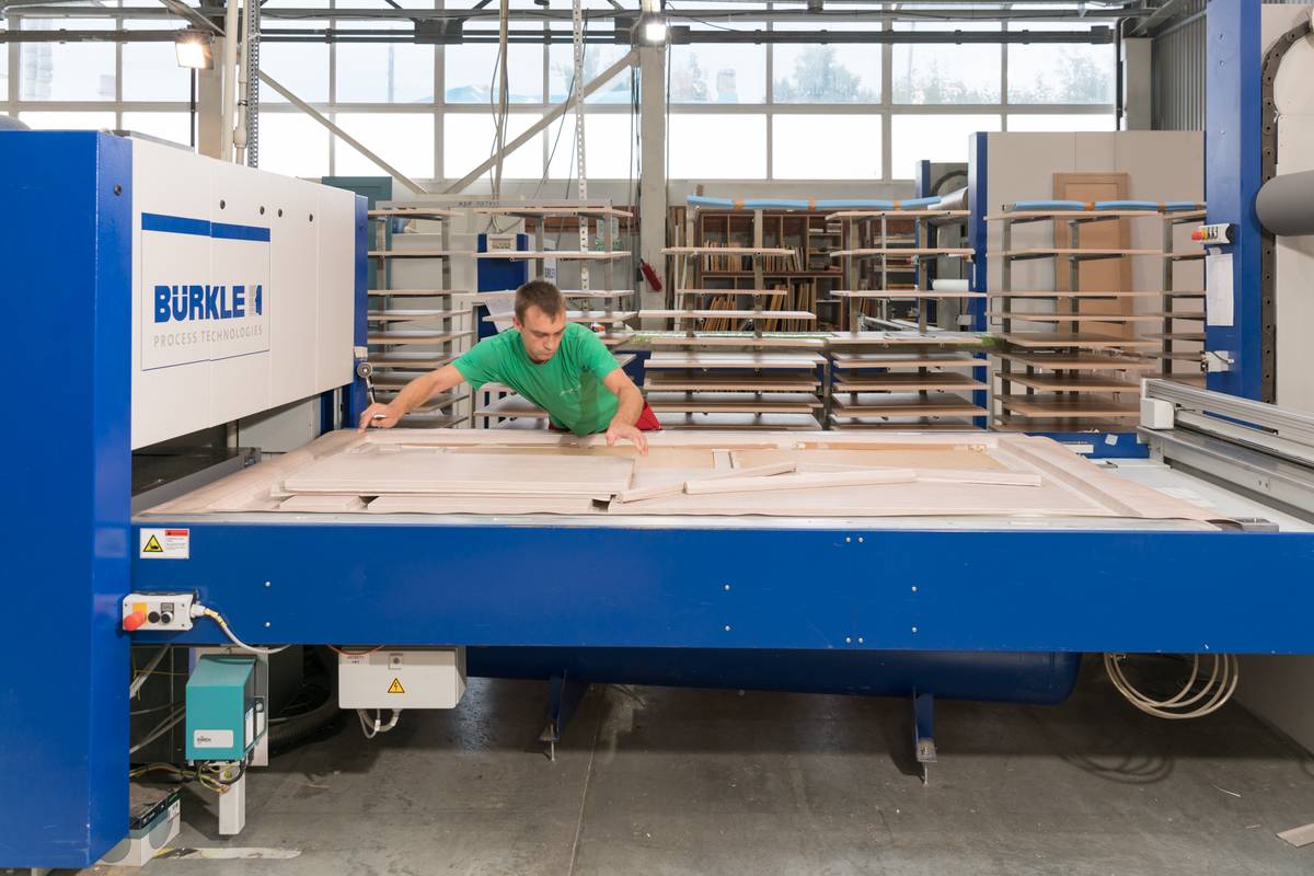 Chipboard countertops are veneered with plastic on a Burkle machine (Italy).