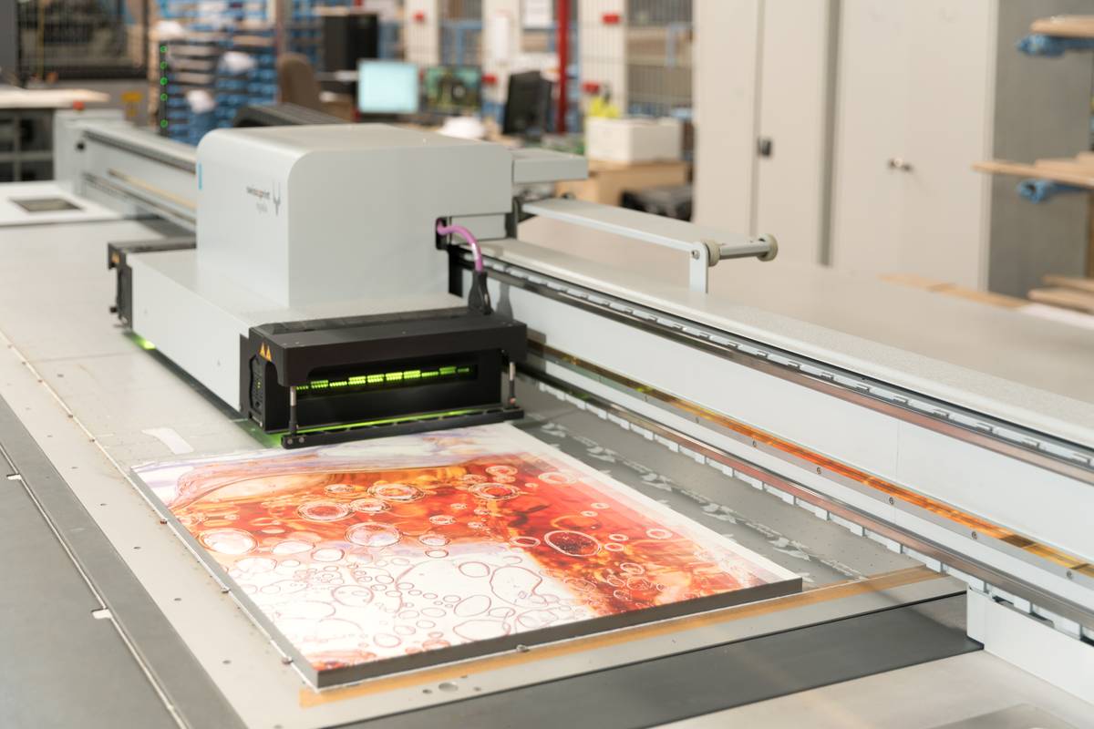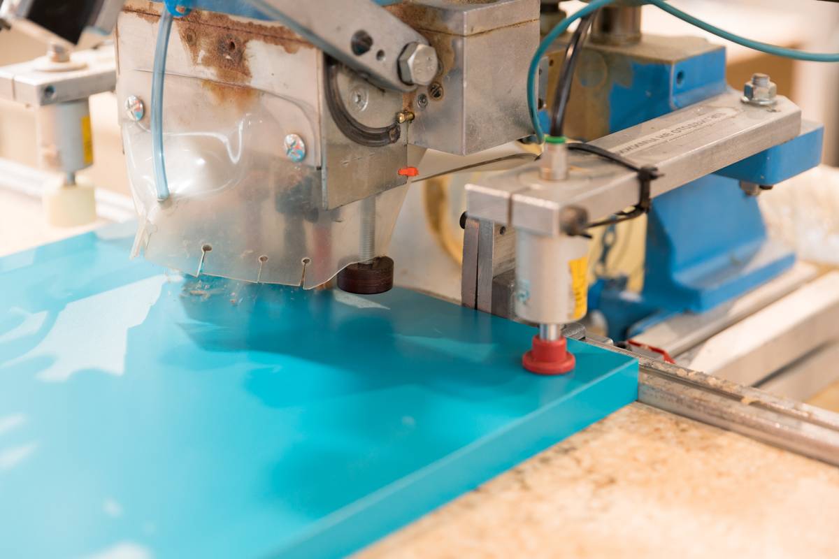Milling MDF facades is done by the Homag Vantage 33 machine (Germany). Karim Rashid’s signature wave is cut out on the Karma model. It will be made of colored glass and illuminated with the color of the kitchen. Burkle machine (Germany) is used аor lining MDF facades with thermoplastic. Its productivity is 650 items per day.