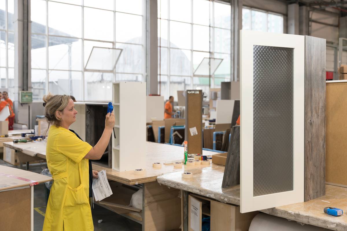 There are 13 assembly lines that make sections for 130 kitchens per day.