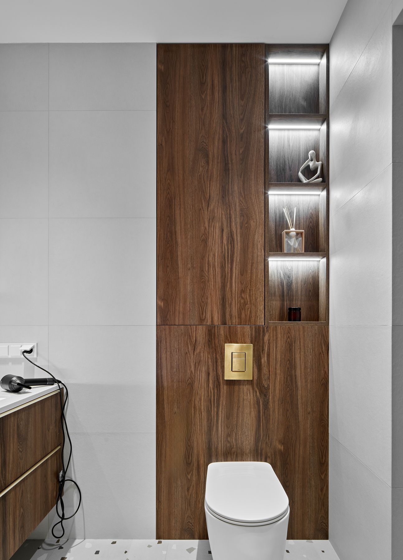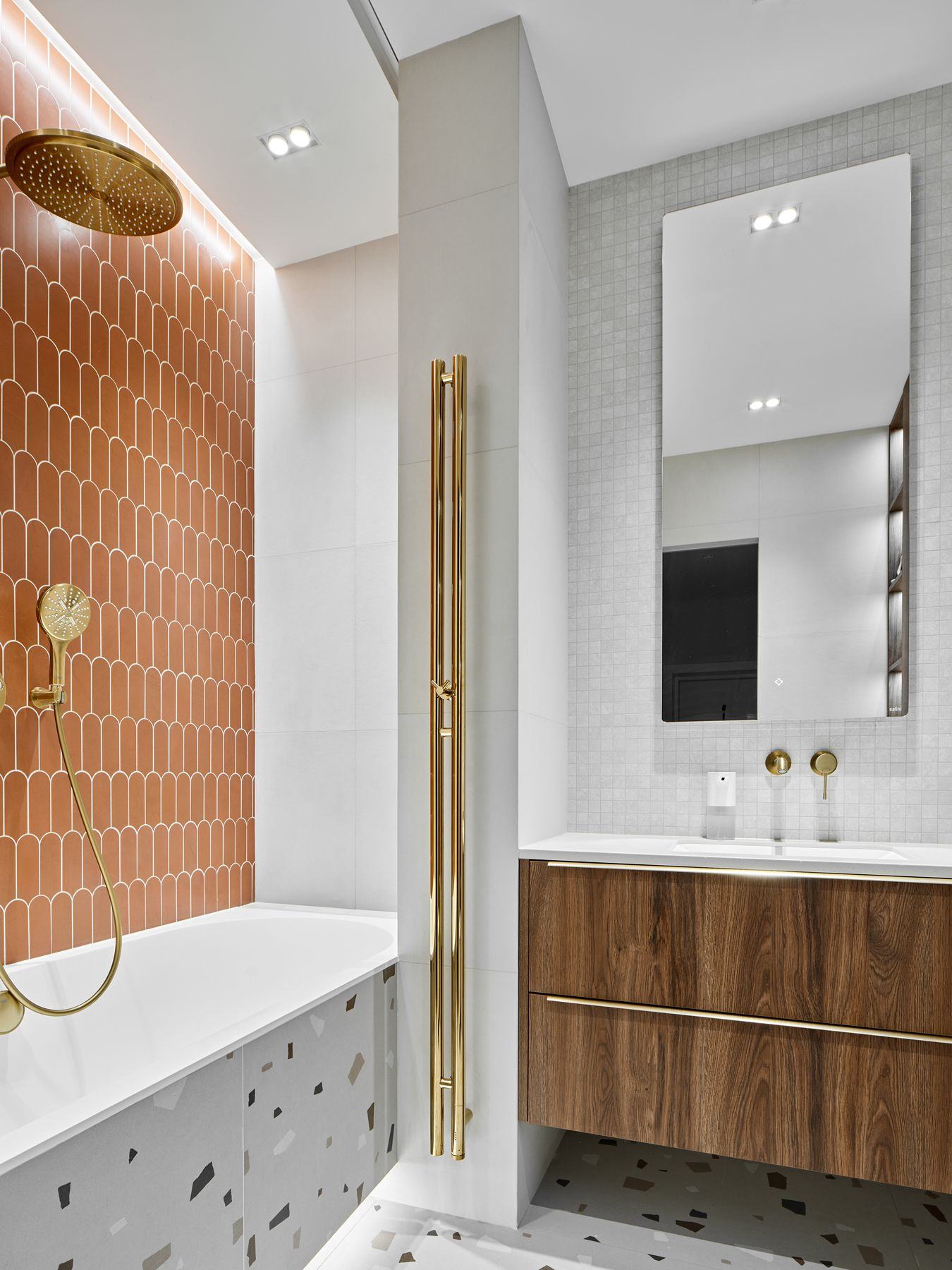 В едином стиле выполнены и другие помещения. В прихожей установлен яркий терракотовый шкаф со скрытыми отделениями и подсвеченной нишей для обуви. В ванной комнате разместилась функциональная тумба под раковину со столешницей из искусственного камня и шкафчик над инсталляцией.