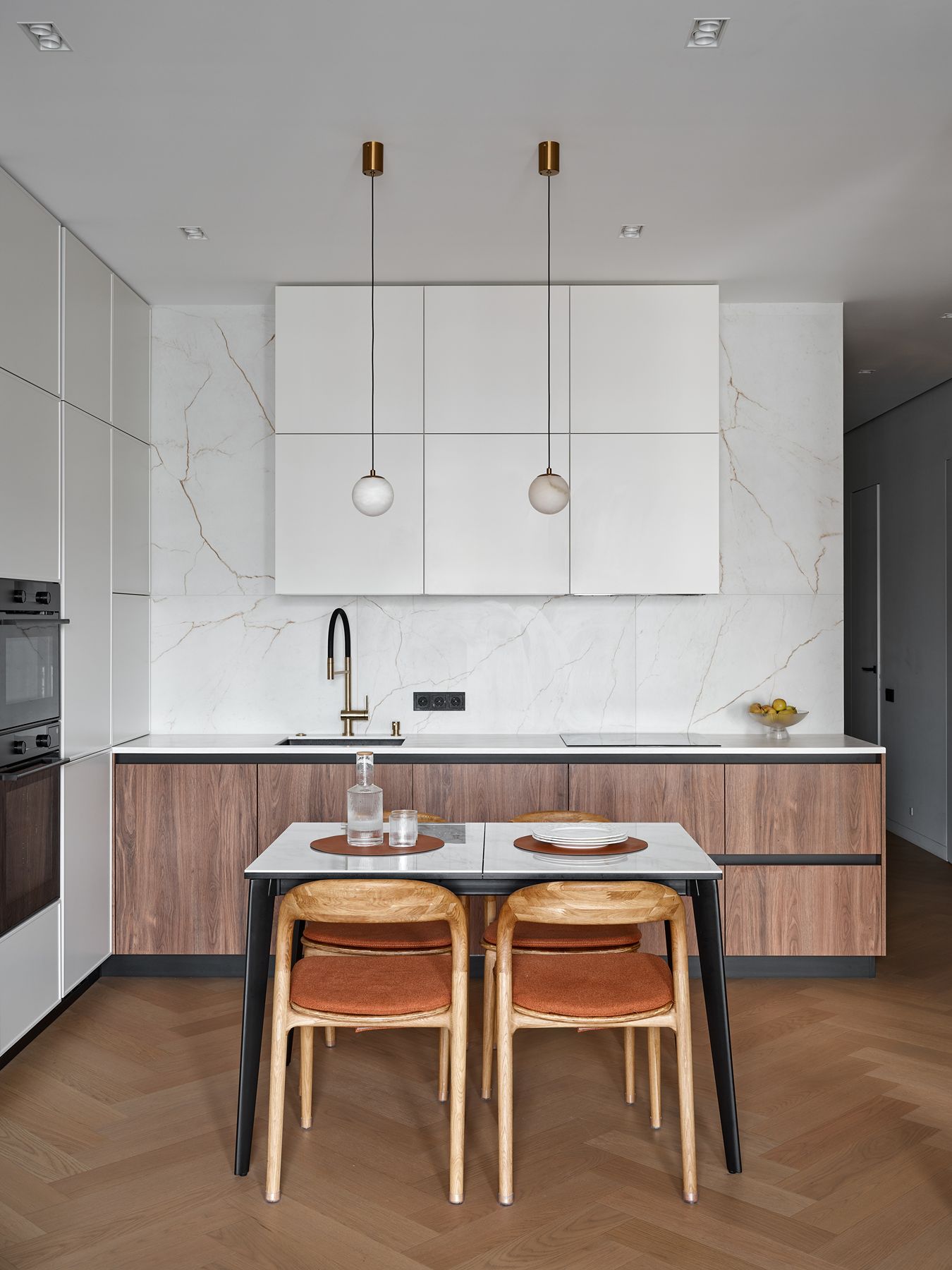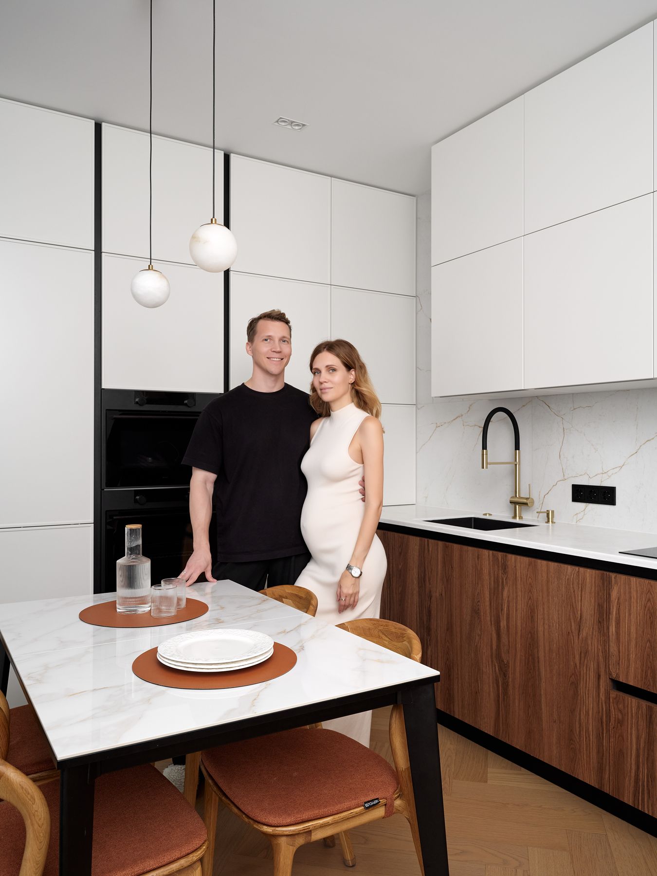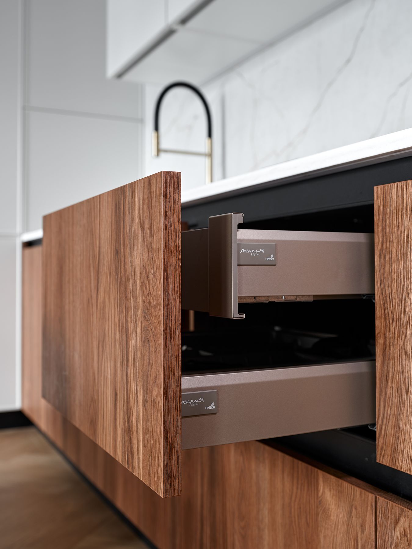 Центральное место заняла просторная кухня-гостиная. Ее уникальность – в смелом сочетании трех моделей: лаконичных белых фасадов Джаз, практичных древесных Микс 22 и неоклассических Доминика с тонкими рамками. Такое дизайнерское решение позволило создать сложную, но гармоничную композицию. В рабочей зоне – столешница из искусственного камня, а продуманные системы хранения (выдвижные ящики, сушка, кофе-гараж) получили высшую оценку от супруги телеведущего.